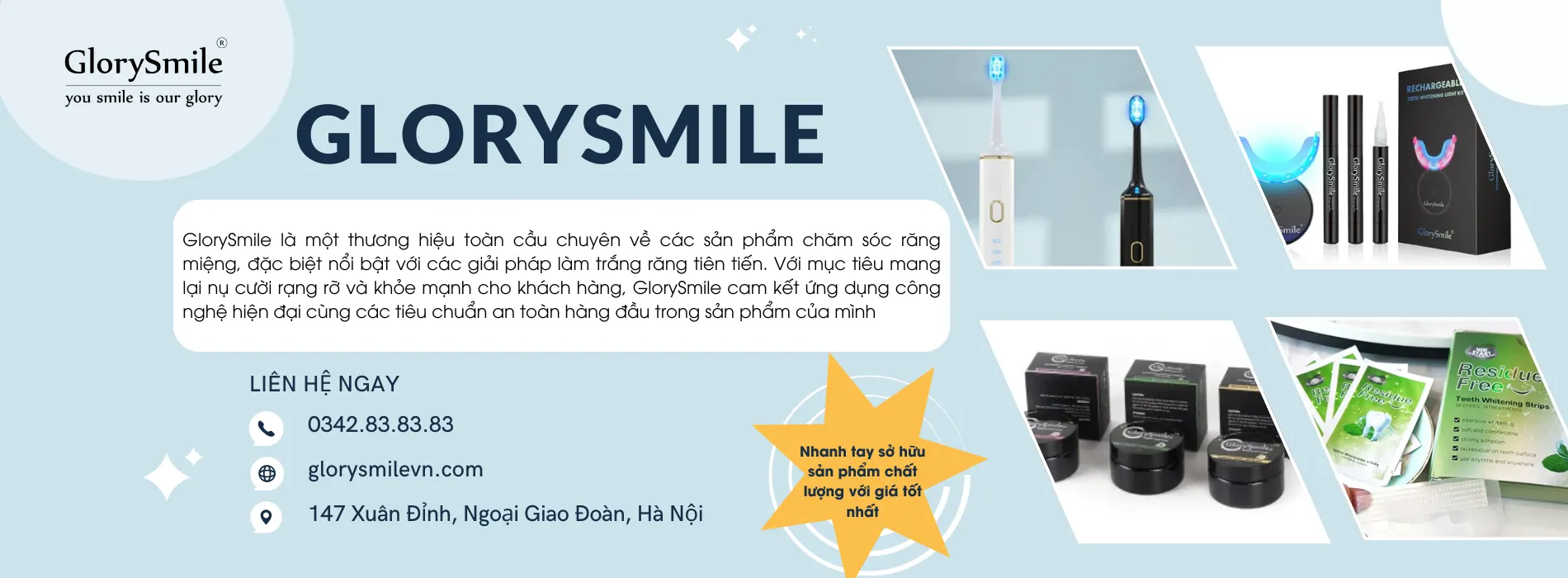 GlorySmile là một thương hiệu toàn cầu chuyên về các sản phẩm chăm sóc răng miệng, đặc biệt nổi bật với các giải pháp làm trắng răng tiên tiến. Với mục tiêu mang lại nụ cười rạng rỡ và khỏe mạnh cho khách hàng, GlorySmile cam kết ứng dụng công nghệ hiện đại cùng các tiêu chuẩn an toàn hàng đầu trong sản phẩm của mình.